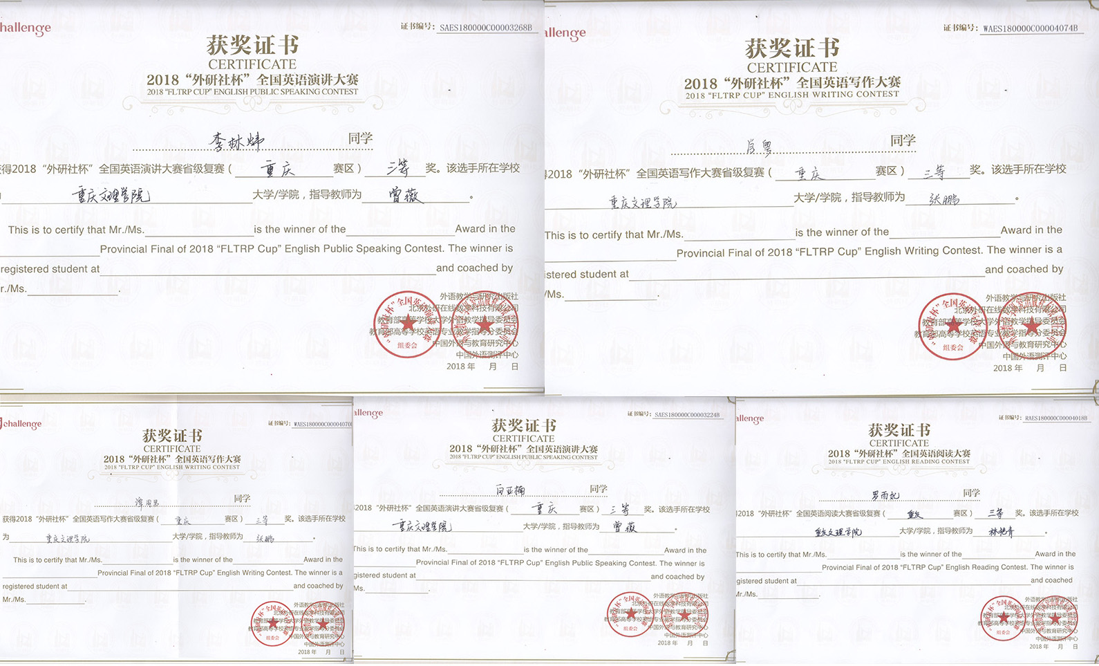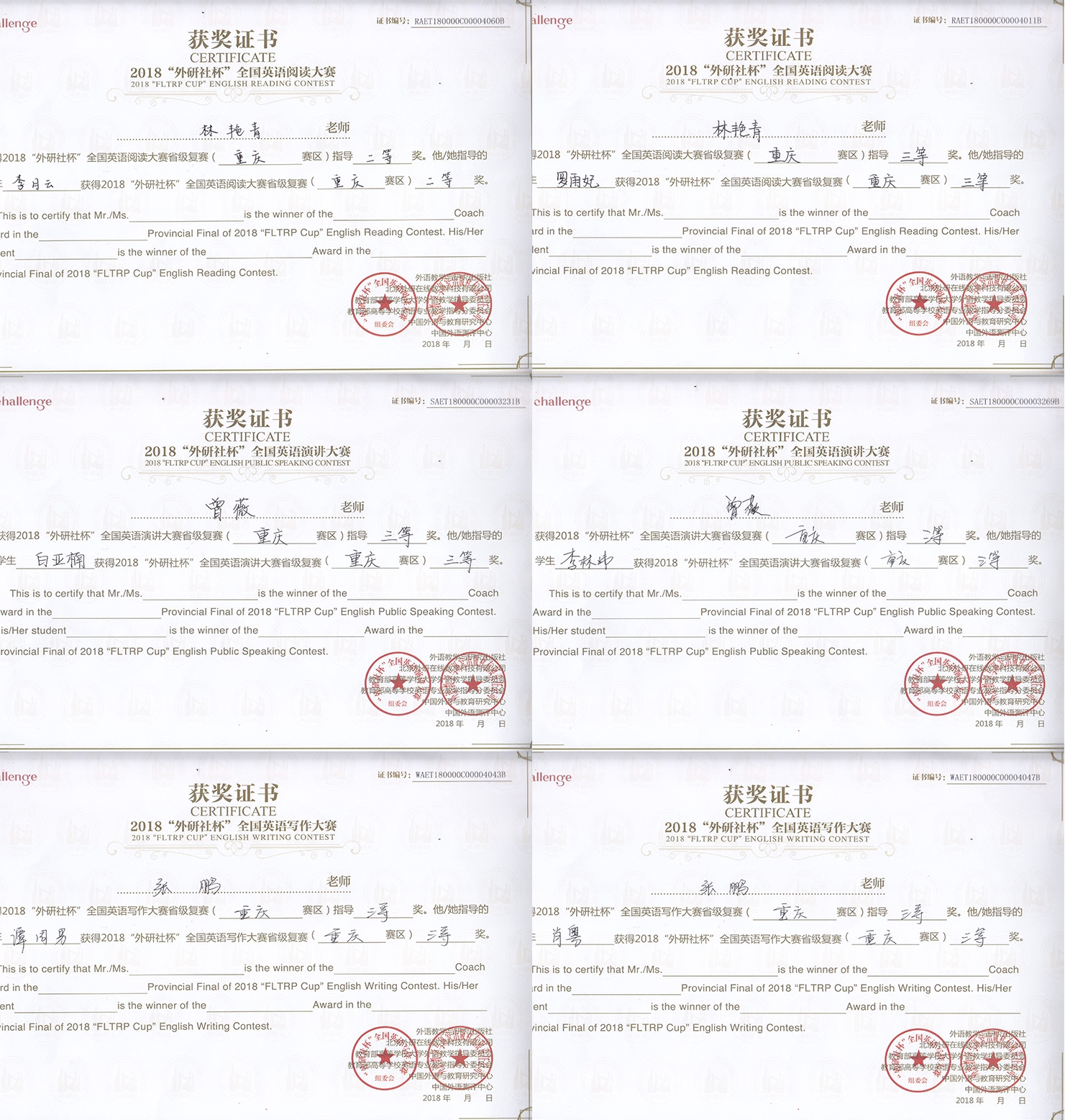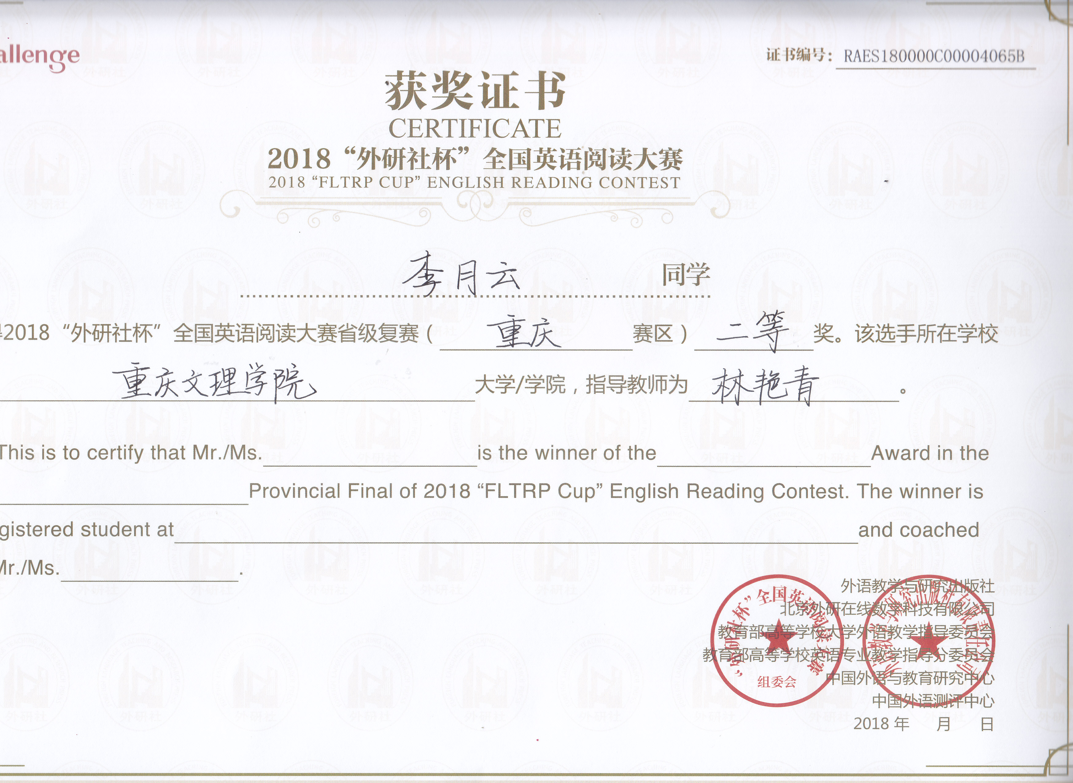 我校选派了六名选手参赛。经过层层角逐,由林艳青老师指导,来自mansion88明升的李月云同学荣获英语阅读比赛的二等奖,来自教育学院的罗雨妃同学荣获英语阅读比赛的三等奖。由张鹏老师指导,来自mansion88明升的谭周男同学和教育学院的肖粤同学荣获本次写作大赛的三等奖。由曾薇老师指导,来自mansion88明升的李林炜同学和材料与化工学院的白亚楠同学分获演讲比赛英语专业本科组和大学英语本科组的三等奖。