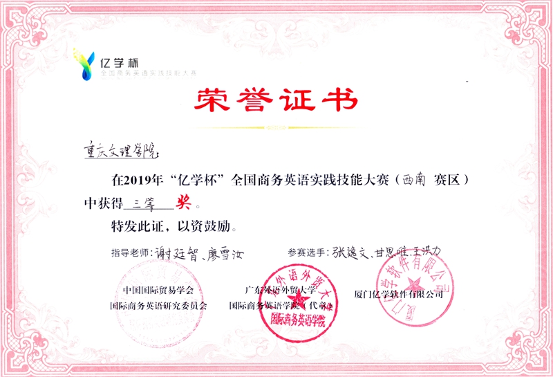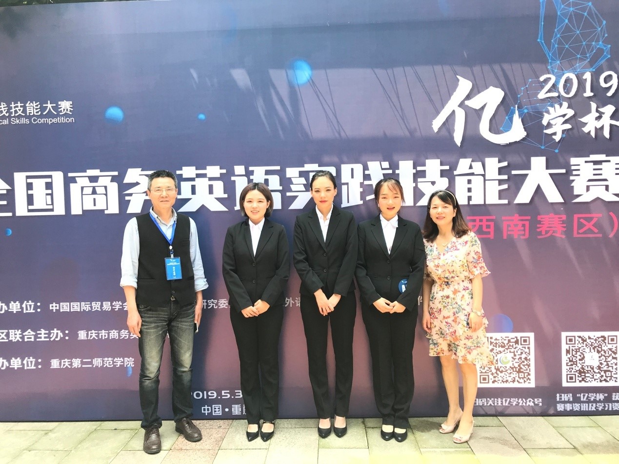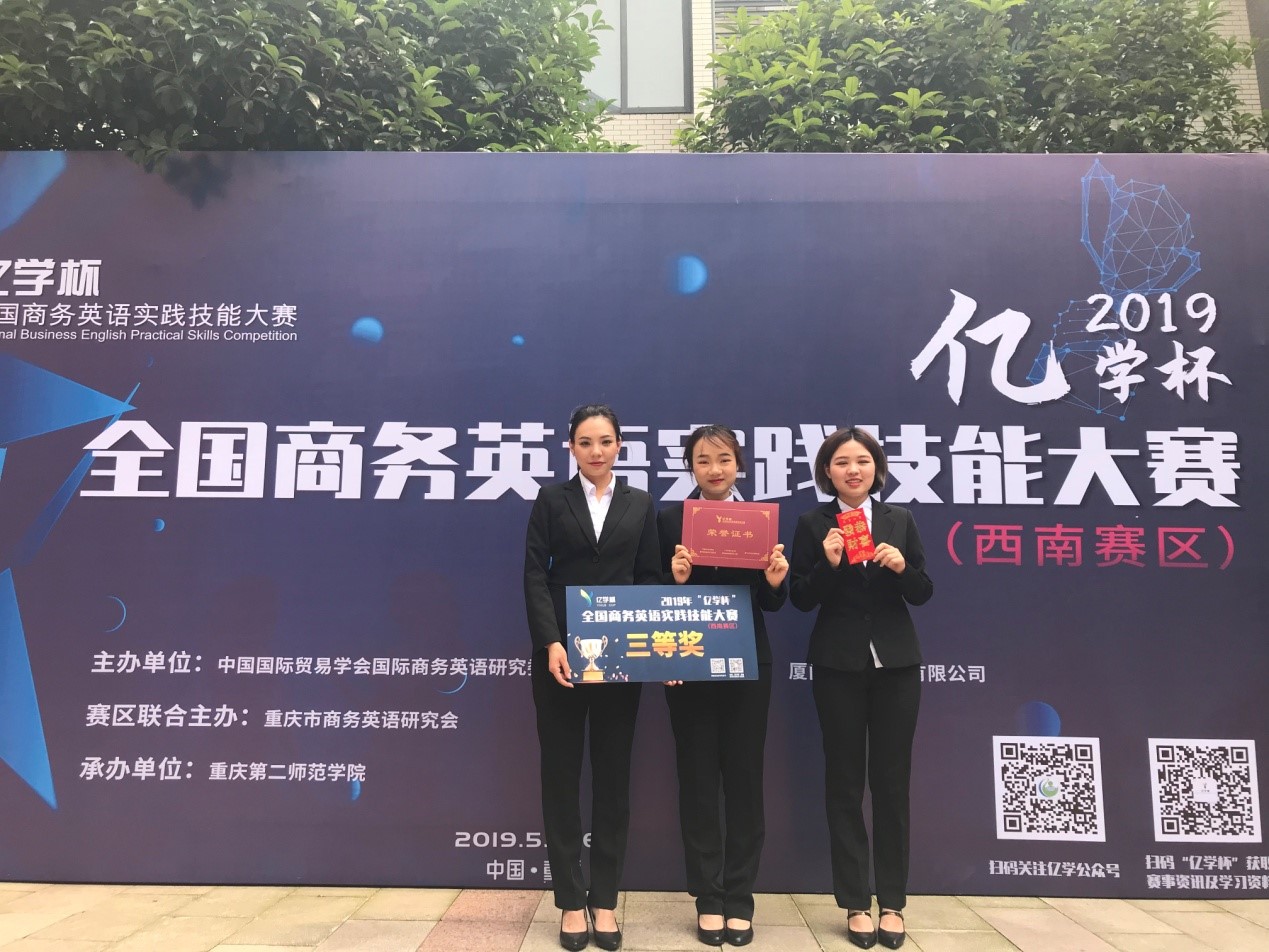 5月31日-6月1日,2019年“亿学杯”全国商务英语实践技能大赛(西南赛区)在重庆第二师范学院举行,来自四川外国语大学、西南财经大学等高校的17支代表队参加了本次大赛。mansion88明升商务英语专业大二学生张逸文、甘思维和王洪力三名同学,在商务英语教研室谢廷智和廖雪汝老师的指导下,经过精心准备,反复演练,通过平台竞赛和现场展示两个环节的激烈竞争, 最终获得三等奖。