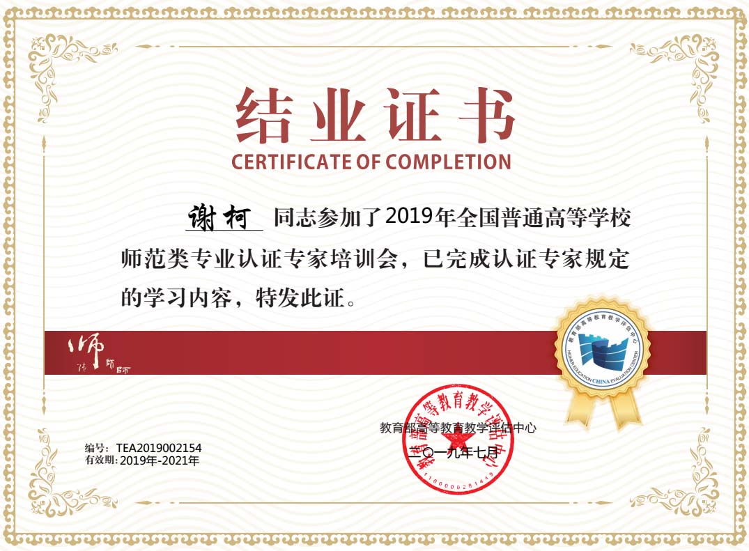 2019年6月30日到7月2日,教育部高等教育教学评估中心在沈阳召开了2019年师范类专业认证第二期专家培训,谢柯教授应邀参加。本次培训会主要的培训内容是师范教育改革与师范类专业认证、师范类专业认证标准解读与考查要点、现场考查流程与工作经验分享、认证管理信息系统与数据分析报告的应用等。参训并获得结业证书后,谢柯教授正式进入师范类专业认证专家库,具备认证资质。