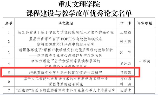 mansion88明升吕娥娥老师撰写的论文《培养英语专业学生课外阅读习惯的行动研究》获得课程建设与教学改革优秀论文评审一等奖;张之材老师申报的《大学英语A4》、龚莲英老师申报的《英语写作》课程获得“课程思政”重点项目立项;谢廷智老师申报的《综合商务英语》、彭娅老师申报的《大学英语A3》课程获得“课程思政”一般项目立项。