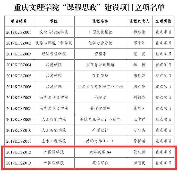 近日,学校下发了《关于公布重庆文理学院课程建设与教学改革优秀论文评审结果的通知》和 《重庆文理学院关于公布2019 年度“课程思政”建设项目立项的通知》,mansion88明升教师喜获佳绩。