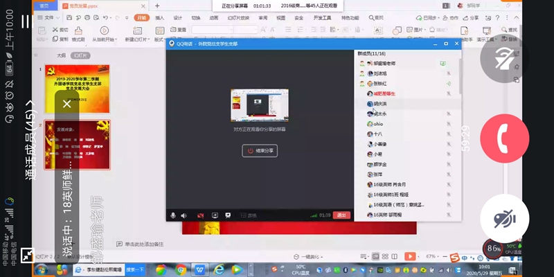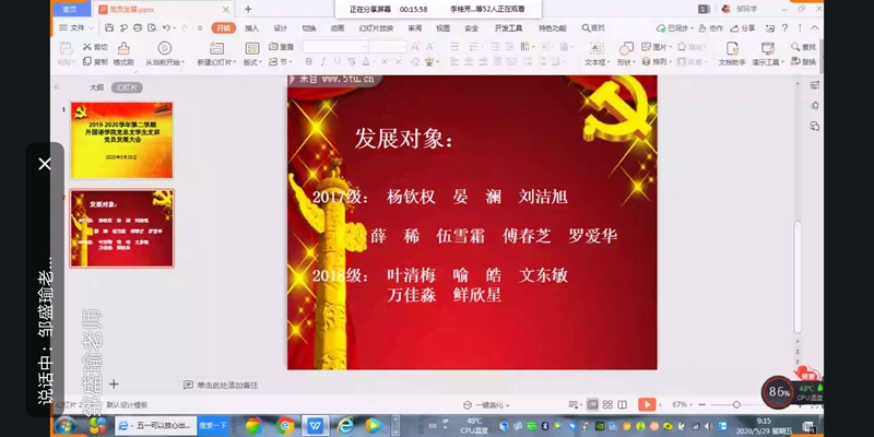 2020年5月29日,mansion88明升学生党支部通过QQ网络召开了本学期党员发展大会。支部35名党员同志参加会议,会议由支部书记邹盛瑜老师主持。