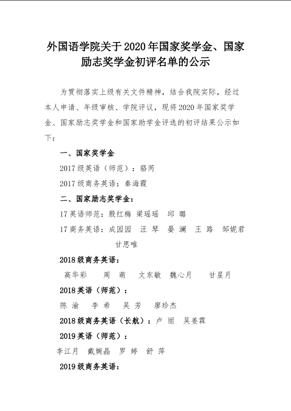 mansion88明升关于2020年国家奖学金、国家励志奖学金初评名单的公示