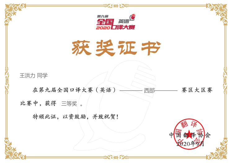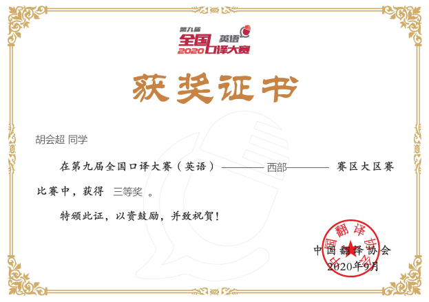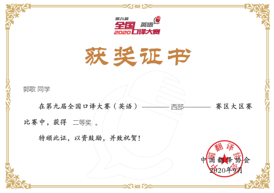 2020年8月29至30日,由中国翻译协会主办,中国翻译协会语言服务行业创业创新中心和北京甲申同文翻译有限公司共同承办的第九届全国口译大赛(英语)西部赛区大区赛落下帷幕,来自重庆、四川、云南、贵州、宁夏、青海、甘肃、新疆、陕西、广西、海南11省市各高校的216名选手参加了此次西部大区赛竞赛。mansion88明升代表队3位选手准备充分,沉稳冷静,凭借扎实的专业功底和出色表现全部获奖,其中郭歌荣获二等奖,胡会超和王洪力荣获三等奖。