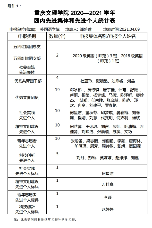 根据《重庆文理学院学生奖励办法》规定,重文理团〔2021〕3号文件精神和《开展2020年度各类先进集体和先进个人评选的有关事宜通知》要求,经辅导员文件宣讲,学生个人申请,年级推荐,学院审核后,将2020—2021学年“五四”评优的拟定名单公示如下:
