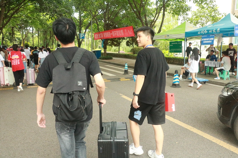 在报到现场,志愿者们克服风雨交加、烈日炎炎等困难,在新生接待服务点,热情接待每一位新生,带领他们到资料核验处、核酸检测处、寝室等办理入学手续,处处看到他们忙碌地身影,拉着行李箱、搬被褥,汗珠从脸颊涌出,依旧露出开心的笑脸,志愿者们累并快乐着。