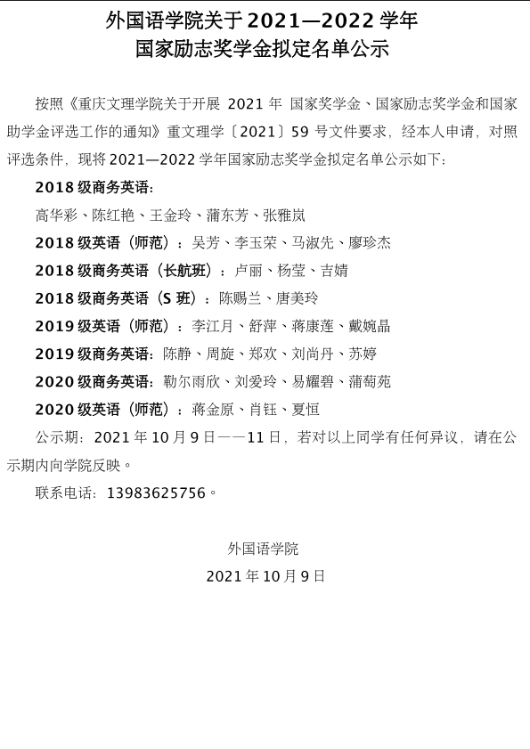 mansion88明升关于2021—2022学年国家励志奖学金的拟定名单公示