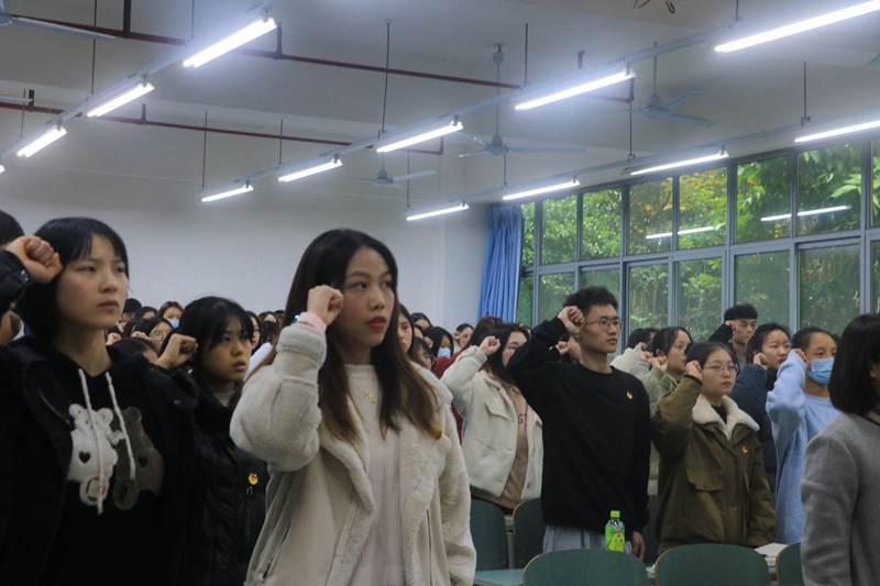 11月17日下午,mansion88明升第六期团校在知行楼B103顺利开班,学院党总支书记杜勇、团总支书记邹盛瑜、校团委干事黄荣出席开班仪式,仪式由2020级学生汪自萍主持,第六期团校全体学员90余人参加。开班仪式在齐唱共青团团歌中拉开序幕,全体成员重温了入团誓词。