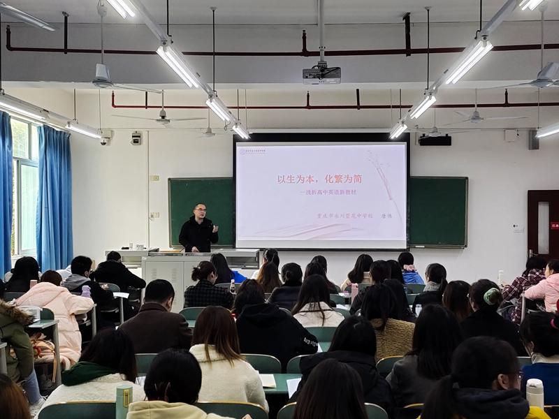 唐伟以“以生为本、化繁为简——浅析高中英语新教材”为题,介绍了高中英语教材与教师用书的编写依据、课程结构、核心素养、课程内容与单元教学建议,并结合萱花中学高中英语教研共同体所开展的实践活动,以一个单元的教学设计为例,向学生展示了如何用好新教材,培养学生的核心素养。唐老师还针对学生关心的问题进行了解答,现场气氛活跃,学生纷纷表示深受启发。