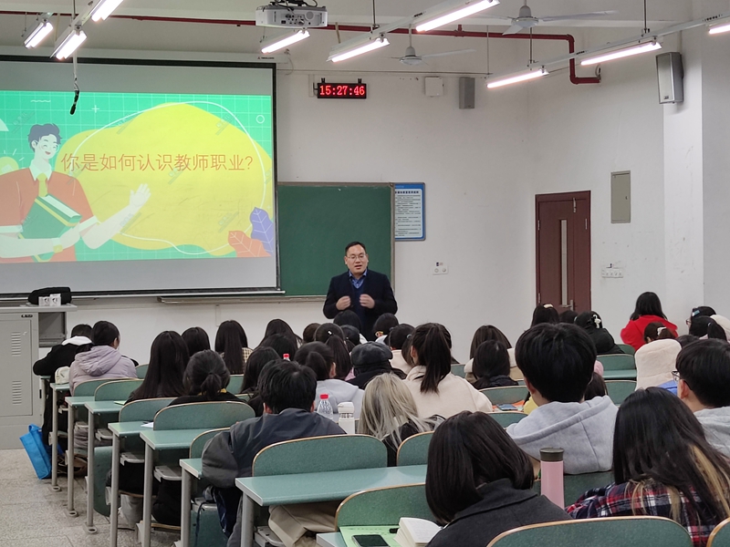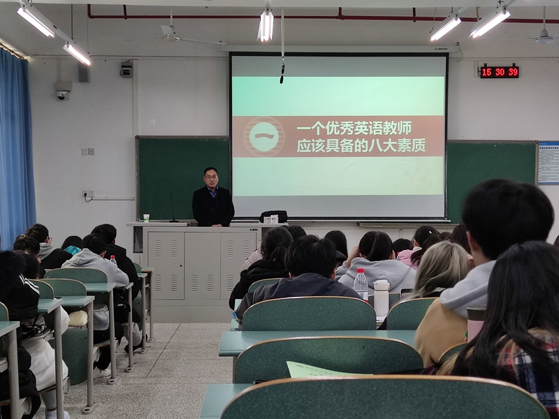 梁老师以“执着的教书历程”为题,用“怎样规划自己的大学生活?如何认识教师这一职业”两个问题,与同学们开展互动,并结合自身丰富的教学及管理经验,分析了一名优秀英语教师必须具备的八大素质,特别针对英语教师成长的三个阶段---潜心修炼期、用心锻炼期、真心苦练期进行了细致的阐释,对同学们在校期间如何强化专业功底、努力成长为合格的英语准教师作了明确引导,鼓励同学们严于律己,练好本领,踏实进取,报效祖国。课堂教学内容充实,气氛活跃,给学生们留下了深刻的印象。