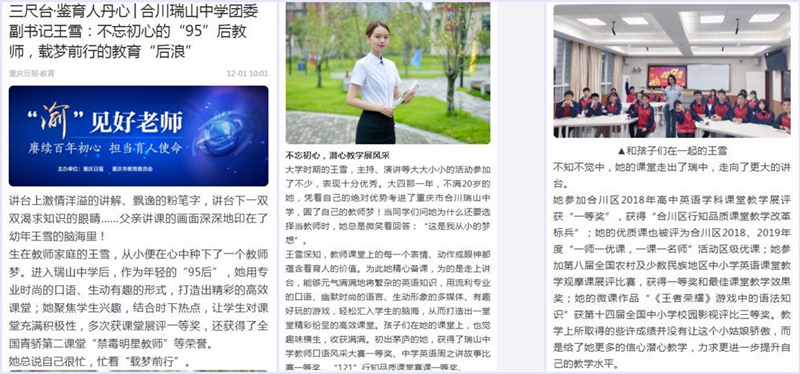 12月1日,重庆日报以《三尺台·鉴育人丹心》深度报道了mansion88明升2012级英语(师范)专业校友王雪的先进事迹。