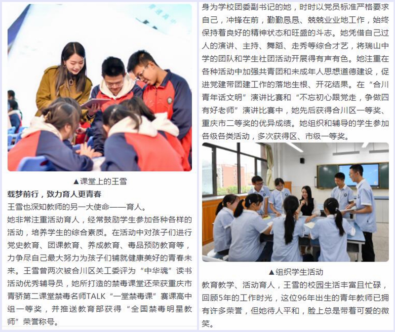 王雪在校期间,担任学院主要学生干部,多次获得奖学金,积极参加校院各类活动并多次获奖。2016年6月,凭着自己的绝对优势考进了重庆市合川瑞山中学,圆了自己的教师梦!在教师岗位上,她兢兢业业,爱生如子,多次参加合川区、重庆市乃至国家级比赛,多次获得好成绩。