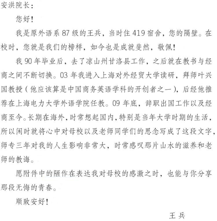 校友王兵是原外语系英语专业87级学生,1987年9月,意气风发的他,怀着对大学校园的憧憬与梦想,报考了重庆师范高等专科学校(现重庆文理学院)。在母校留下的每一道足迹,每一份回忆,后来总是萦绕在远赴千里之外,辗转祖国南北、漂洋过海的游子王兵心头,于是他提笔写下这封书信,向学院刘安洪院长讲述了他的求学与工作经历中所感悟到的师专三年对他人生产生的巨大影响,道出了对母校和同学们的深切思念和感激之情。