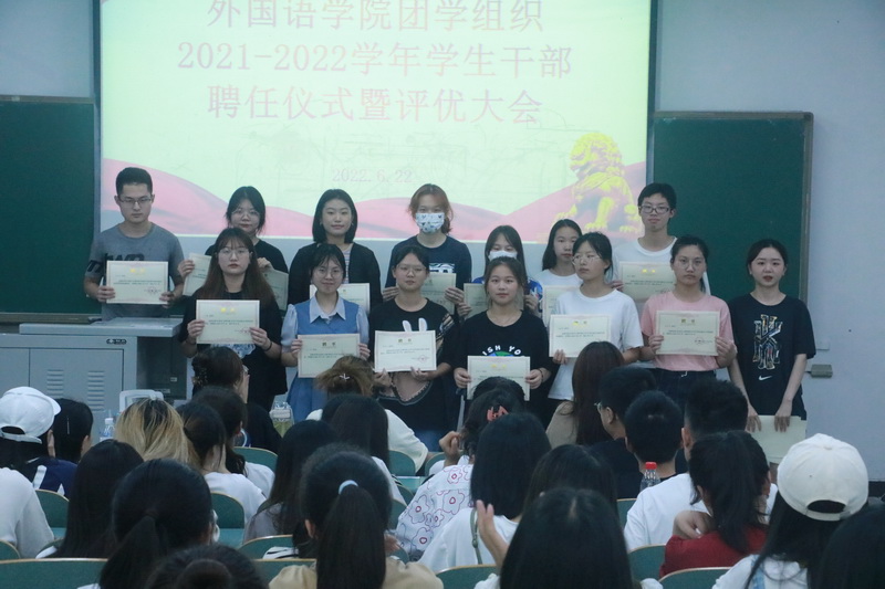 会上,首先对本学年团学组织主席团成员及各部门干部、干事颁发聘书,随后对这一学年中表现突出的优秀干部及优秀干事给予表彰。现场气氛热烈,不时爆发出阵阵掌声。最后,团总支书记邹盛瑜总结讲话,他肯定了mansion88明升团学组织在学生工作中发挥的积极作用和取得的优异成绩,总结了2021-2022学年mansion88明升的各类学生活动开展情况,对mansion88明升团学组织取得的进步与成绩表示认可。