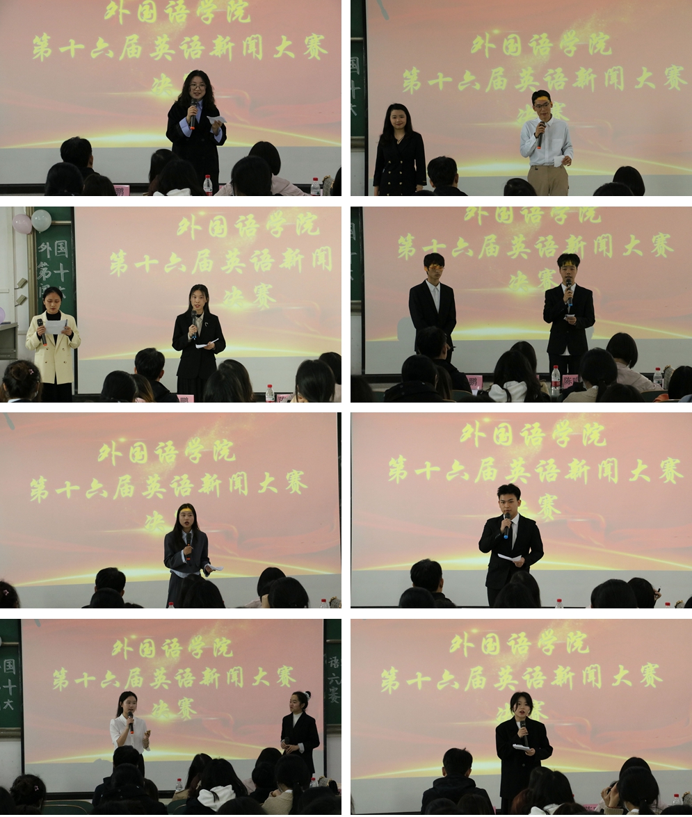 经过初赛,复赛的激烈比拼,共有六组12名选手进入决赛。比赛中,选手灵活运用英语专业知识以及出彩的口语表达,以新颖视角切入新闻材料,以辩证思维论证新闻内涵,向观众呈现较高水准的新闻播报。最后,代玥程、蒋金原荣获一等奖,吴心元、杨其欣、陈京鹏、梁桓铭获得二等奖,雷诺、伍礼航、黄罗源、刘桐、王秋月、周洁获得三等奖。