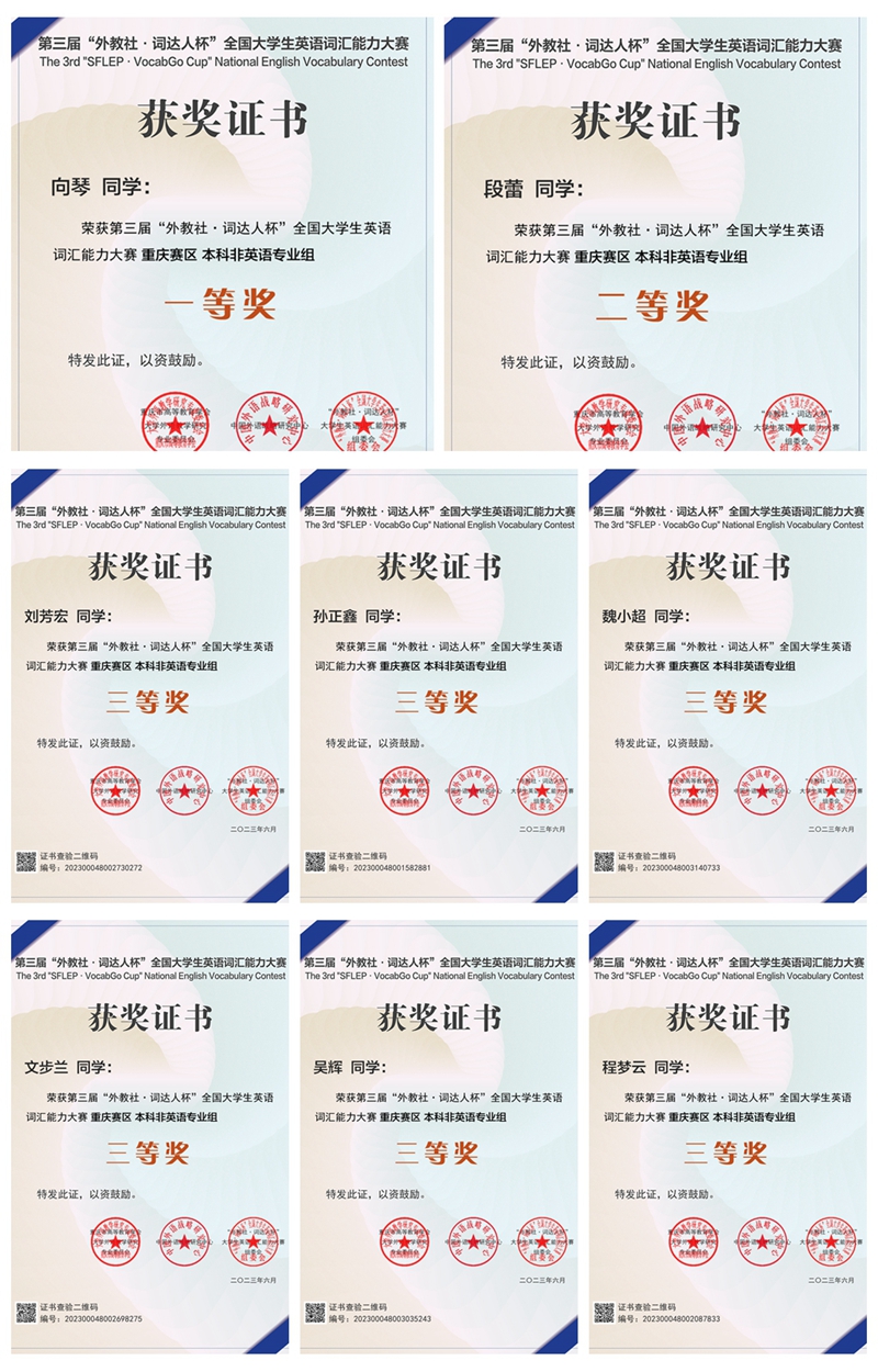 5月13日,mansion88明升组织晋级省赛的学生在知津楼六阶集中参加了重庆市复赛。最终,我校2021级材料科学与工程向琴同学获得非英语专业组重庆市一等奖,2020级材料科学与工程段蕾等7位同学获得非英语组重庆市三等奖;mansion88明升2020级商务英语苟小霞和黄诗琪、2020级英语(师范)蒋金原、2021级商务英语的朱瑜获得英语专业组重庆市三等奖。
