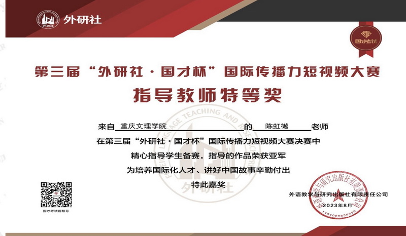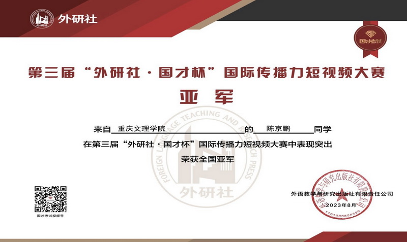 本届大赛的主题为“中国人物”,鼓励大学生通过自媒体平台,使用外语讲述自己身边的故事,以生动自然的方式对外传播中国文化,展现中国故事的世界意义和当代价值。大赛于3月23日开启,由选拔赛和全国决赛两个阶段组成,来自全国729所院校的10,000多名大学生参加了选拔赛,投稿作品近4000份,涵盖9个语种。经评审,共396份作品晋级全国决赛。学校高度重视此项比赛,由mansion88明升牵头,选派骨干教师成立指导教师团队,在全校学生中遴选了21名学生参加了重庆市选拔赛。经过激烈角逐,2021级商务英语专业陈京鹏、2022级英语(师范)专业朱聘元、2022级商务英语专业陈柳冰和丁洋的作品在省赛中脱颖而出,晋级全国决赛。最终经过专业评审及大众投票,陈京鹏荣获全国亚军,朱聘元、陈柳冰和丁洋荣获全国三等奖。陈虹樾、杜玲、邓若岚老师荣获全国优秀指导教师奖。据悉,本届大赛共决出全国冠军1项,亚军2项,季军3项,一等奖14项。