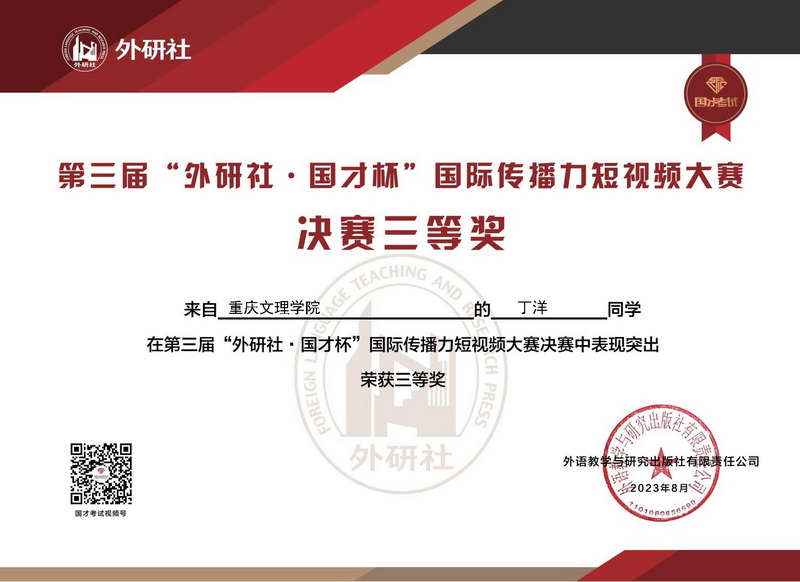 近日,第三届“外研社·国才杯”国际传播力短视频大赛全国决赛圆满结束。mansion88明升学生陈京鹏的作品《中国人物——重庆棒棒毛启君》荣获全国决赛亚军,朱聘元的作品《中国人物——涂铭旌》、陈柳冰和丁洋的作品《中国人物——李兰娟》荣获全国决赛三等奖。