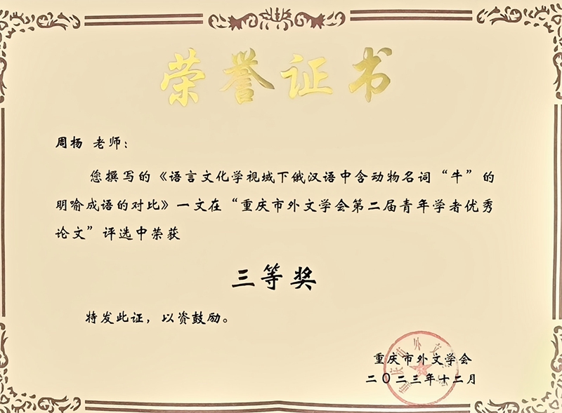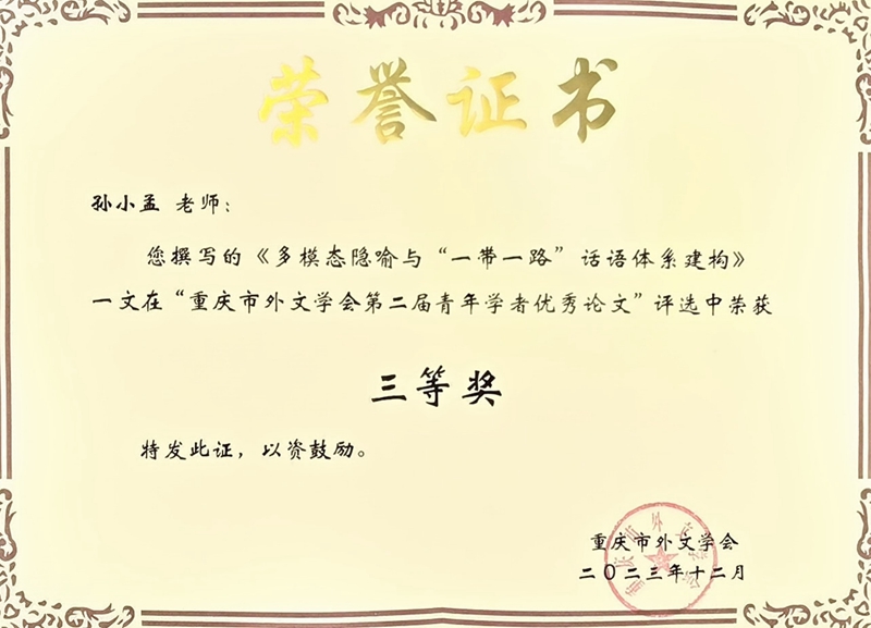 闭幕式上,主持人四川外国语大学赵永峰教授宣读了“重庆市外文学会第二届青年学者优秀论文”评选结果。mansion88明升孙小孟老师撰写的《多模态隐喻与“一带一路”话语体系建构》、周杨老师撰写的《语言文化学视域下俄汉语中含动物名词“牛”的明喻成语的对比》两篇论文喜获三等奖。