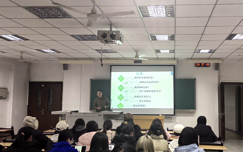 蒋德勇老师曾荣获“全国十佳班主任”,是全国优秀班主任工作室—邓斌班主任工作室成员,也是市级班主任工作室主持人,获评重庆市“优秀辅导员”、九龙坡区“优秀辅导员”等荣誉称号。蒋老师以“班级经营的着力点”为题,围绕“班主任建什么样的班、班主任应具备什么样的品性、班级经营靠什么、班干部如何选拔培养、班级如何运转、班级活动怎样设置、班级读本如何打造”七个方面,结合了大量的实践案例,给全体学生讲述了班主任工作的理论与实践经验,并从爱心、用心、责任心等几个方面对学生进行了激励与鼓舞。教学内容充实,案例典型接地气,给学生们留下了深刻的印象。