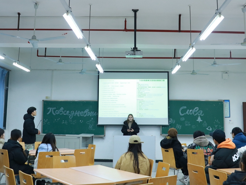 俄语沙龙围绕“Повседневный русский язык(学习日常俄语)”主题,展开对俄语的学习与交流。留学生阿西亚通过以日常口语、言语礼节、语言对话等环节讲授,激发大家对俄语学习的兴趣,内容丰富,生动有趣。随后,大家踊跃发言,留学生鼓励同学们继续保持对俄语热爱,深入学习俄语,了解俄罗斯的文化。
