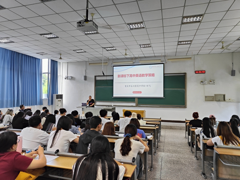 田飞以“新课标下高中英语教学策略”为题与大家进行面对面交流,他以其丰富的教学经验,为学生带来了一场富有启发性的交流盛宴。他首先深入解读了《普通高中英语课程标准》(2017年版2020年修订)中的课程目标,使学生们对新课标有了更为清晰的认识。随后,他以人教版高中英语教材为实例,进行了生动的课例分析,细致入微地展示了单元整体教学的实施策略。最后,他分享了自己丰富的教学经验,从如何精彩地开启第一堂英语课,到如何巧妙衔接初高中英语教学,再到如何高效推进高中英语教学,每一个细节都娓娓道来,让学生们受益匪浅。此次认知见习活动让2022级英语师范专业学生深入地了解了新课标下的高中英语教学策略,既为课程学习奠定了坚实基础,也为试讲和毕业实习等教学实践活动的高质量开展提供了有力保障。