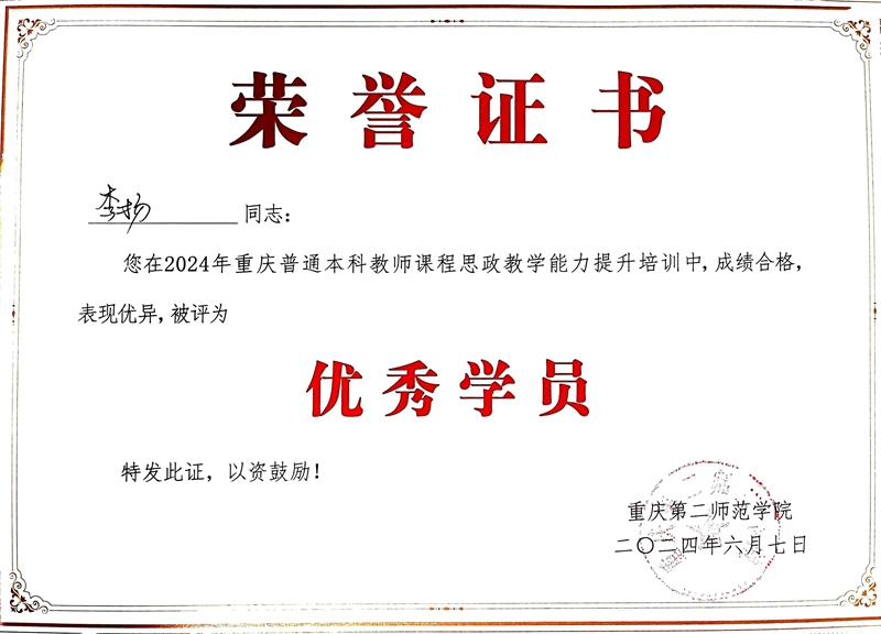 为深入贯彻落实习近平总书记关于教育的重要论述,贯彻落实全国教育大会和高校思想政治工作会议精神,继续推进课程思政建设,全面提升教师课程思政教学能力,6月1日-7日,2024年重庆普通本科教师课程思政教学能力提升培训班在重庆第二师范学院举行,mansion88明升教师李扬应邀参加。