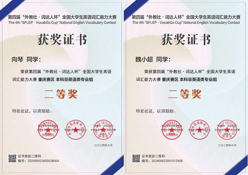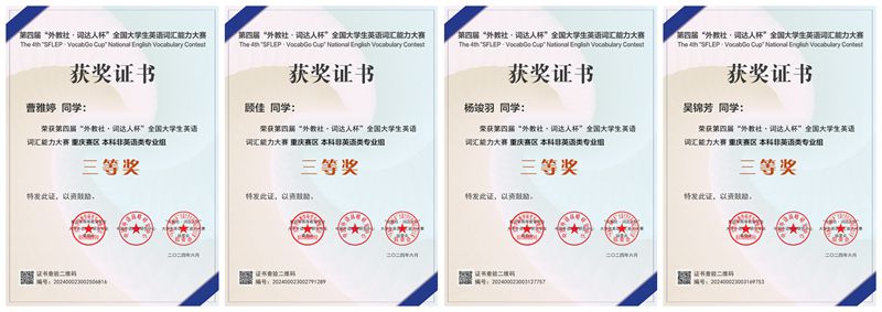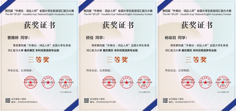 经过激烈角逐,我校2021级材料科学与工程专业学生向琴、2021级风景园林专业学生魏小超获得非英语组重庆市二等奖;2022级思想政治教育(师范)专业学生曹雅婷、2022级数据科学与大数据技术专业学生杨竣羽、2021级思想政治教育(师范)专业学生吴锦芳、顾佳获得非英语组重庆市三等奖;mansion88明升2021级英语(师范)的王秋月、杨秋坪、杨翠蓉三位同学获得英语专业组重庆市三等奖。