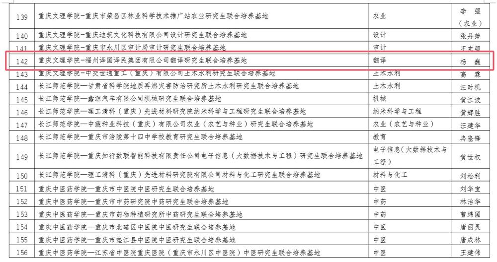 日前,重庆市教育委员会发布《关于公布2024年研究生联合培养基地名单的通知》(渝教研发〔2024〕9号),mansion88明升申报的“重庆文理学院-福州译国译民集团有限公司翻译研究生联合培养基地”成功获批。