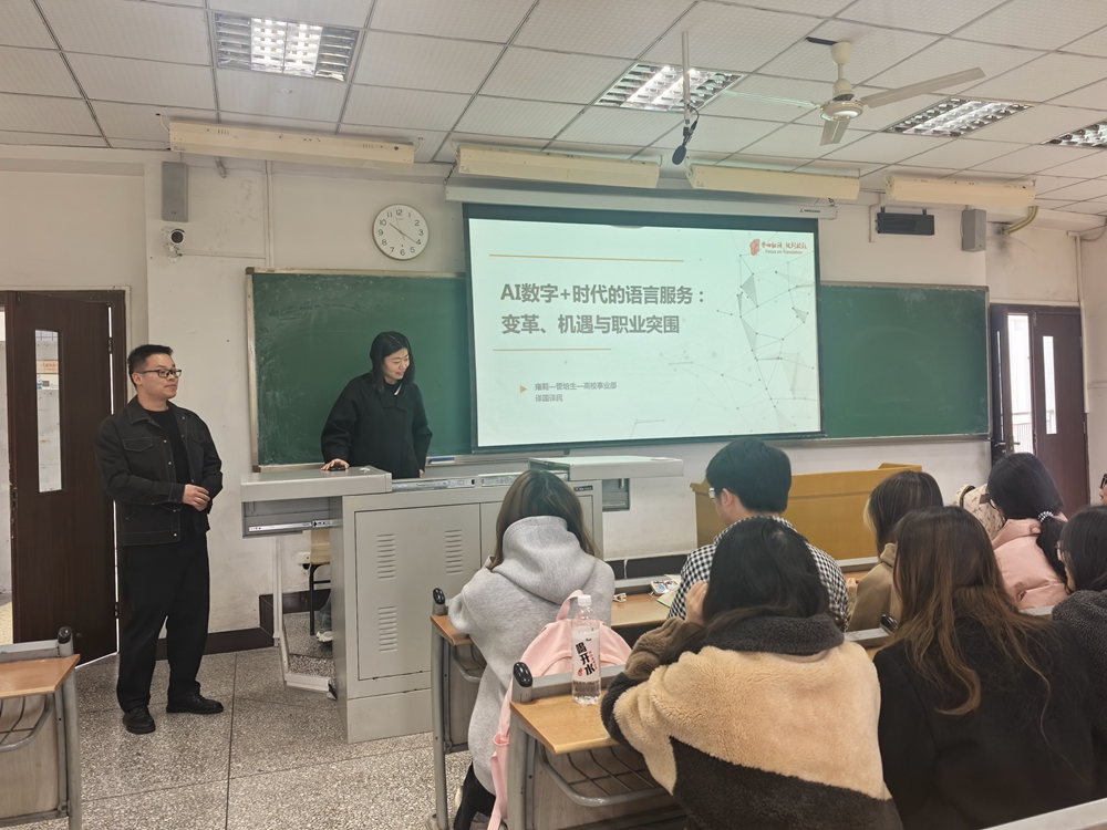 福州译国译民集团有限公司高校事业部雍莉以“AI数字+时代的语言服务:变革、机遇与职业突围”为题,阐述了翻译行业的服务性、协作性和主观性等特征,并深入剖析了这些特性对行业发展的影响。她强调,优秀的翻译人员需具备扎实的语言能力、熟练的翻译技术、良好的团队协作精神和项目管理能力等多方面的综合素养。吴强与学生进行了深入交流,为学生提供了职业规划建议。