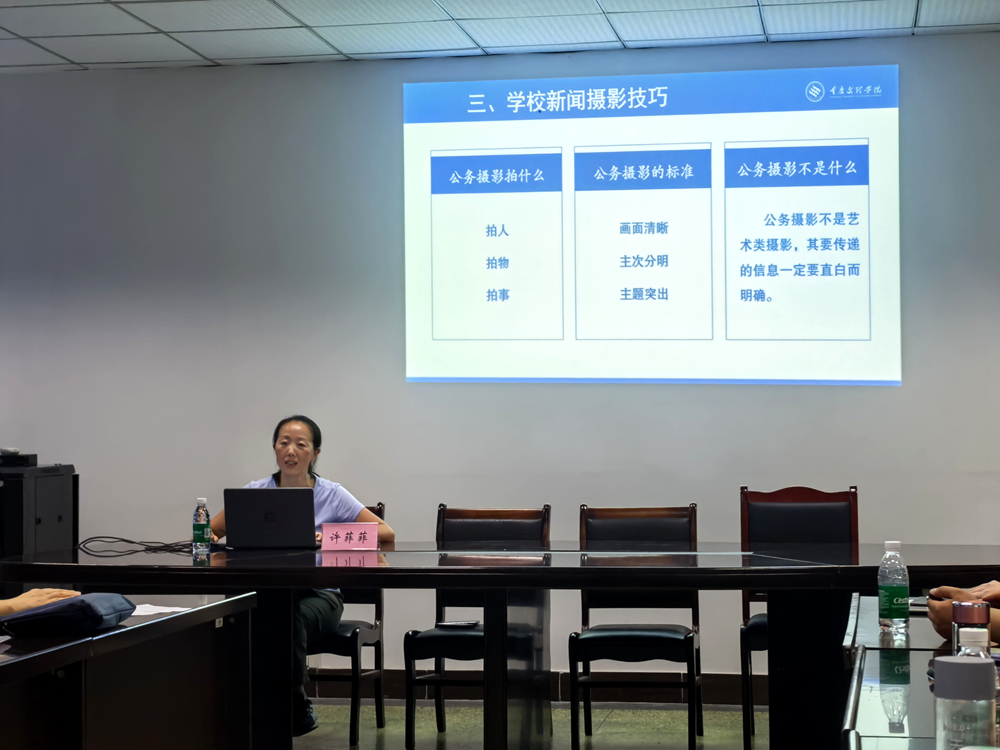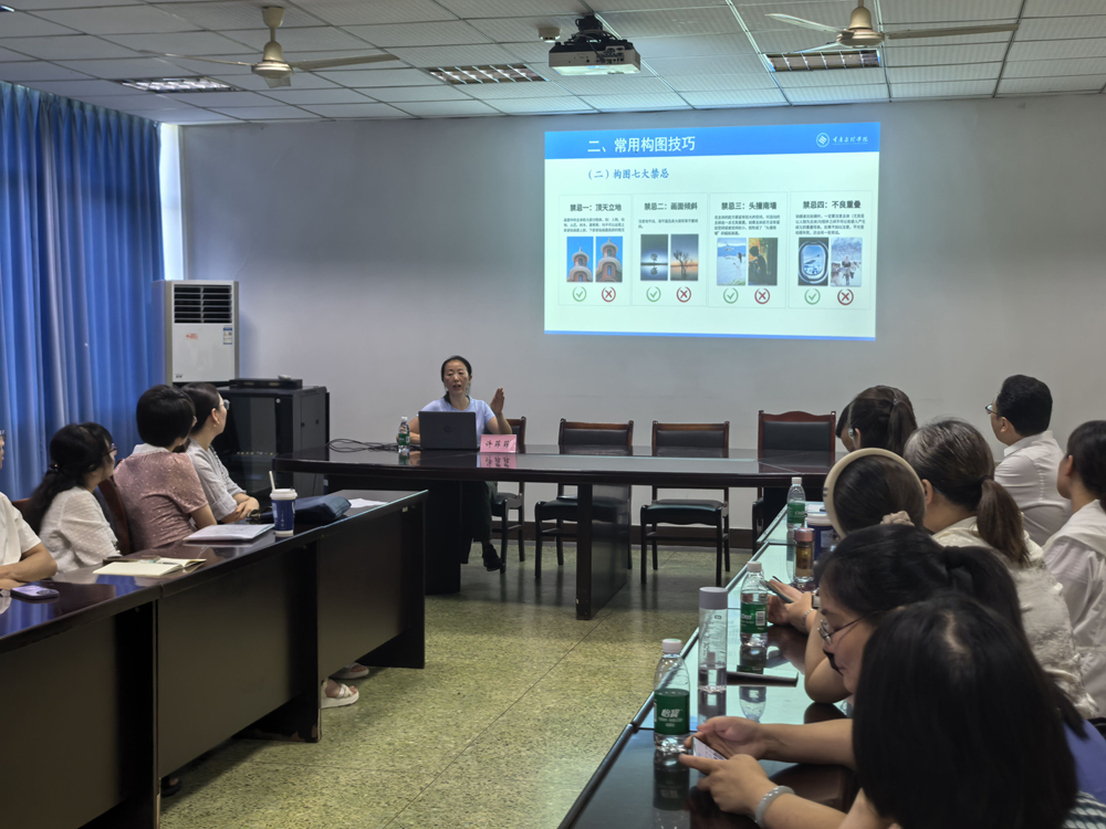 许菲菲围绕“摄影基础知识”、“常用构图技巧”、“校园新闻摄影技巧”、“手机摄影教程”四个方面,结合经典照片解析光影、构图、配色等技巧,并针对会议、校园活动等常见场景,深入浅出进行了讲解。通过现场示例学院网页宣传图片,许菲菲一一指出有待改进的地方。参训人员纷纷表示“突出主体、捕捉瞬间”非常实用。